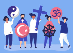 People holding diverse religious symbols illustration