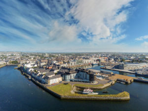 Aerial view on Galway city, river Corrib, Claddagh area, Sunny d
