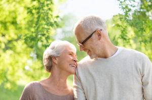 happy senior couple over green natural background